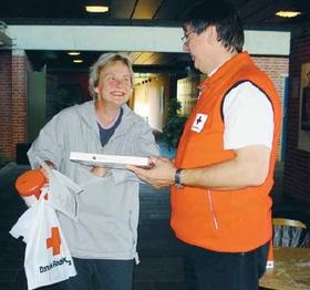 På billedet ses hun sammen med Terry Hawkins, formand for Røde Kors, Grenaa Afdeling, der overrækker hende en æske chokolade. I Grenaa-området indsamlede 48 frivillige ca. 50.000 kr og på Anholt 2 frivillige ca. 2.500 kr.