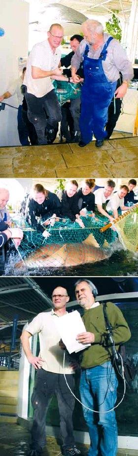Det kræver både mange hænder og mange kræfter at »genhuse« en 130 kilo tung nursehaj. [midten] Denne nurse-haj var ikke indstillet på at blive flyttet uden kamp. Der måtte således hele to forsøg til for at få den op på den båre. [nederst] Både radio og TV var repræsenteret ved Store Hajflytnings-dagen i Kattegatcentret i Grenaa. Her ses centrets direktør Jørgen Møller sammen med en radiojournalist fra DR.