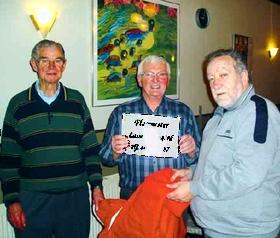 Til højre formanden for Glesborg Forsamlingshus og Borgerforening, Knud Erik Christensen. Til venstre den afgående flagmester, Orla Boe Pedersen, og i midten den nye flagmester , Lasse Bjerregård.