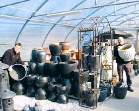 Det var hvad Grenaa Plantecenter modtog i en plomberet 40 fods container i sidste uge. Og ikke én eneste krukke var gået i stykker undervejs fra Sydøstasien til Nordeuropa! På billedet ses Ejner og Keld fra Grenaa Plantecenter under arbejdet med at få de stillet de mange flotte krukker på plads i plantecentret.