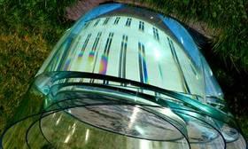 Motivet er Glasmuseets historiske Hack Kampmann-bygning fanget i et af Bert Frijns’ udendørs værker. Værket bestÃ¥r af tre kar, stablet oven i hinanden. Den seneste mÃ¥neds regn har fyldt karrene med vand, sÃ¥ der opstÃ¥r sjove optiske effekter i værkerne – her en ”osteklokke” med den gamle toldbod i.