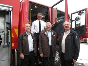 To borgmestre, en beredskabschef og en stolt leverandør. Beredskabschef Leif Bang (øverst) var kravlet til vejrs på den nye brandbils trappe, så han kunne overskue Norddjurs' borgmester Torben Jensen (til venstre), Syddjurs' borgmester Vilfred Friborg Jensen og Frank Hauberg, direktør i Hauberg Technique, som har leveret den nye motorsprøjte til Djurslands beredskab.
