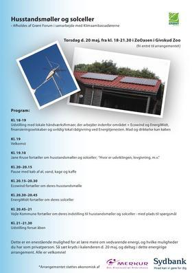 Informationsleder på Nordisk Folkecenter for Vedvarende Energi, Jane Kruse indleder arrangementet med at fortælle om den nyeste udvikling både teknisk, økonomisk og lovgivningsmæssigt. Herefter kommer de to forhandlere af henholdsvis husstandsmøller og solceller på banen og fortæller om deres produkters muligheder. Det er firmaet Ecowind, der forhandler en skotsk husstandsmølle i flere forskellige størrelser fra firmaet Proven Energy Ltd., og EnergiMidt der, udover el, fiberbredbånd og rådgivning, også forhandler solceller. Marianne Bjerre fra Vejle Kommune vil kort fortælle om, hvordan sagsbehandlingen i forhold til kommunen foregår, hvis man har planer om at installere enten solceller eller husstandsmøller.