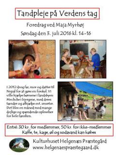I 2012 drog far, mor og datter til Nepal for at gøre en forskel. De ville hjælpe børnene i landsbyen Mechche i bjergene med deres tænder og afhjælpe evt. smerter. Det blev en måned med mange dejlige og spændende oplevelser for hele familien. Entré: 50 kr. Dog kun 30 kr. for medlemmer af foreningen Kulturhuset Helgenæs Præstegård.