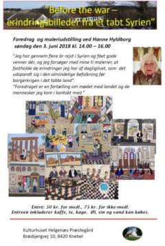 "Jeg har rejst gennem flere år i Syrien og fået gode venner der og jeg forsøger med mine ti malerier, at fastholde de erindringer jeg har af dagliglivet, som det udspandt sig i den almindelige befolkning før borgerkrigen" siger Hanne Hyldborg. - Entré: 75 kr. dog kun 50 kr. for medlememr. Prisen inkluderer kaffe, the, kage. - Øl, vin og vand kan købes.