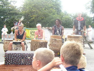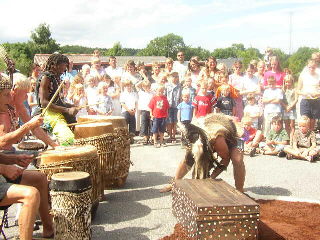 Herefter var det så tid for det bebudede indslag med den lokale gruppe Bayeye, der danser og spiller ægte slangedans, som de har lært det i Sukumaland i Tanzania. Sammen med den superdygtige herboende sukuma-trommeslager, Marco, udgør Uffe Harms på lilletromme og Rex ”Shilungu” Jensen på pulstromme en autentisk trommegruppe, der hurtigt fik både børn og voksne til at føle sig hensat til Afrika (og hér gjorde det strålende sensommervejr også sit). De spillede op til de 2 fordansere, iraneren Madjid Eskandari (hvis søn i øvrigt havde første skoledag på friskolen) og Sander Nielsen, begge i særdeles fantasifulde kostumer og med maling i både ansigtet og på kroppen.