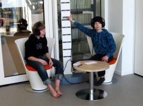 Unge lånere sidder ved "lytteposten" i Kulturperronen. Her kan man høre de nyeste cd'er, som biblioteket har fået hjem.