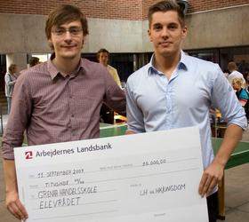 Med tale og kagemand modtog elevrådet på Grenaa Handelsskole en stor check på 10.000 kroner fredag den 11. september. De mange penge får eleverne, fordi de går på den bedste handelsskole i Danmark. Både hhx og hg elever har deltaget i en landsdækkende undersøgelse om skolemiljøet på handelsskolerne, og på Grenaa Handelsskole har forholdsvist flest elever svaret.