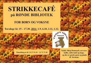 Teddy Shop Danmark holder strikkecafé for børn og voksne. Strikkecafeen er både for børn, unge og ældre, for nybegyndere og øvede. Formålet er at dele inspiration og strikkeglæde. Vi serverer kaffe, saftevand og kage, og der er gratis garn og pinde til børnene.