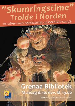 Højtlæsning og fællessang i skæret fra levende lys. Den anden mandag i november slår det landsdækkende højtlæsningsarrangement "Skumringstime" dørene op for 18. gang. På Grenaa Bibliotek er vi også i år med. Dette års tema er: Trolde i Norden. Birgit Årsnes er oplæser og vil supplere den obligatoriske "skumringstime-tekst" - et uddrag fra Stefan Spjut: Stallo, med andre nordiske tekster. Svend Frandsen akkompagnerer på klaver, når vi ind imellem oplæsningen og kaffedrikningen synger et udvalg af vores nordiske sange. Der er fri entré og ikke behov for forhåndstilmelding.