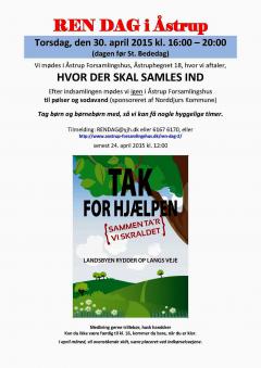 I samarbejde med grundejerne i og omkring Åstrup, laver Åstrup Forsamlingshus en fælles REN DAG torsdag d. 30/4 kl. 16. Der er fri entré.