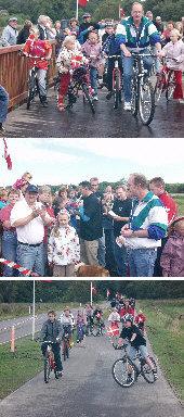 På den nye bro over Ryom Å, der med borgmesteren ord binder nord og syd endnu tættere sammen, gjorde han og hele feltet af cyklister holdt, og Kim Dalgaard Poulsen kunne med et sakseklip og velvagte ord, der kaldte på latteren, erklære ruten for åbnet.