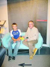 På billedet får han dem overrakt af indehaveren af Schmidt Møbler i Grenaa, Jens Ove Schmidt.