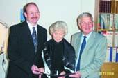 Dette billede er taget i forbindelse med afsløringen af Lions-julemærket for 2004 på borgmesterkontoret i Grenaa. Fra venstre er det Lions-præsident Torben Kristensen, kunstneren bag 2004-julemærket Tut Bendixen og borgmester Gert Schou.