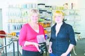 på billedet overrækker indehaveren af salonen, Joan Thygesen, den flotte præmie til en glad Katrine.