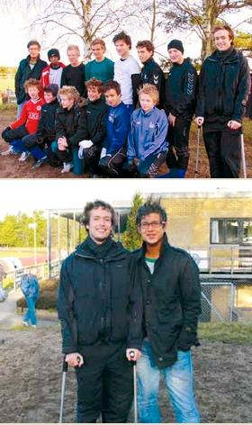 [øverst] Et hold juniorer i Grenaa IF, som atter synes, det er sjovt at gå til fodbold. Med på billedet er trænerne Jon Nørgaard og Emil Banner (til højre). Emil Banner brækkede benet under en kamp i november. [nederst] Trænerne Jon Nørgaard og Emil Banner glæder sig over den store aktivitet, der er skabt i GIF's juniorafdeling.